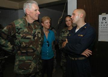Keywords: US Navy 060605-N-3931M-264 Commander, U.S. Pacific Command, Adm. William Fallon, talks with U.S. Navy Lt. Robert Senko assigned to the Medical Treatment Facility aboard U.S. Military Sealift Command (MSC) Hospital ship USNS Mer.jpg en Jolo Philippines June 5 2006 - Commander U S Pacific Command Adm William Fallon talks with U S Navy Lt Robert Senko assigned to the Medical Treatment Facility aboard U S Military Sealift Command MSC Hospital ship USNS Mercy T-AH 19 while touring a Medical and Dental Civil Action Project MEDCAP at Camp Asturias Jolo Station Hospital Mercy is on a five-month deployment to South Asia Southeast Asia and the Pacific Islands The medical crew aboard Mercy will provide general and ophthalmology surgery basic medical evaluation and treatment preventive medicine treatment dental screenings and treatment optometry screenings eyewear distribution public health training and veterinary services as requested by the host nations Like all U S Naval forces Mercy is able to rapidly respond to a range of situations on short notice Mercy is uniquely capable of supporting medical and humanitarian assistance needs and is configured with special medical equipment and a robust multi-specialized medical team who can provide a range of services ashore as well as aboard the ship The medical staff is augmented with an assistance crew many of whom are part of non-governmental organizations which have significant medical capabilities U S Navy photo by Photographer's Mate 1st Class Michael R McCormick RELEASED 2006-06-05 060605-N-3931M-264 Navy http //www navy mil/view_image asp id 35462 U S Navy photo by Photographer's Mate 1st Class Michael R McCormick PD-USGov-Military-Navy Images from US Navy location Jolo Philippines Aboard USNS Mercy T-AH-19 |