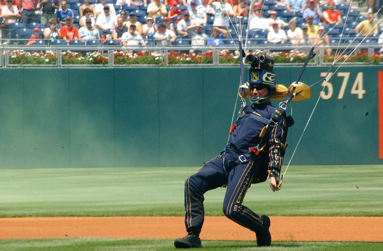 Keywords: US Navy 060618-N-4729H-087 Chief Damage Controlman J.C. Ledbetter assigned to the Navy Parachute Team Leapfrogs, hits the ground at Citizens Bank Park.jpg en Philadelphia June 18 2006 - Chief Damage Controlman J C Ledbetter assigned to the Navy Parachute Team Leapfrogs hits the ground at Citizens Bank Park during the Philadelphia Phillies' pre-game Father's Day show A video camera attached to Ledbetter's helmet captured the performance as he landed in the infield and received cheering welcome from the Philadelphia fans Several of Leapfrogs team members delivered game balls to the team one of which was used as the first pitch thrown by Supreme Court Justice Samuel Alito The Leapfrogs were in town performing on board Naval Air Station Joint Reserve Base Willow Grove Air Show over the weekend U S Navy photo by Chief Journalist Monica Hallman RELEASED 2006-06-18 060618-N-4729H-087 Navy http //www navy mil/view_image asp id 36028 U S Navy photo by Chief Journalist Monica Hallman PD-USGov-Military-Navy Images from US Navy location Philadelphia PA Damage Controlman |