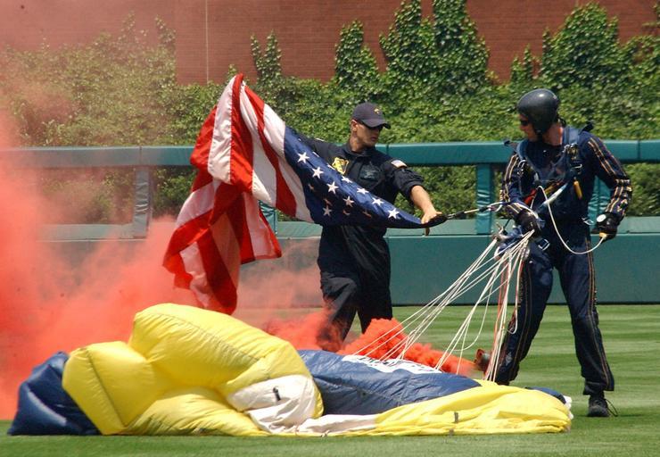 Keywords: US Navy 060618-N-4729H-096 A member of the Navy Parachute Team Leapfrogs unhooks the American flag from the Team Officer in Charge, Lt. Geoff Reeves, after his jump in to Citizens Bank Park.jpg en Philadelphia June 18 2006 - A member of the Navy Parachute Team Leapfrogs unhooks the American flag from the Team Officer in Charge Lt Geoff Reeves after his jump in to Citizens Bank Park during the Philadelphia Phillies' pre-game Father's Day show Several of Leapfrogs team members delivered game balls to the team one of which was used as the first pitch thrown by Supreme Court Justice Samuel Alito The Leapfrogs were in town performing on board Naval Air Station Joint Reserve Base Willow Grove Air Show over the weekend U S Navy photo by Chief Journalist Monica Hallman RELEASED 2006-06-18 060618-N-4729H-096 Navy http //www navy mil/view_image asp id 36029 U S Navy photo by Chief Journalist Monica Hallman PD-USGov-Military-Navy Images from US Navy location Philadelphia PA |