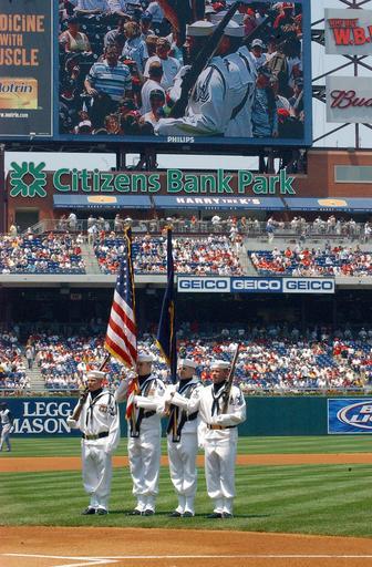 Keywords: US Navy 060618-N-4729H-120 Navy Recruiting District Philadelphia Color Guard members present the American flag on the Citizens Bank Park infield.jpg en Philadelphia June 18 2006 - Navy Recruiting District Philadelphia Color Guard members present the American flag on the Citizens Bank Park infield and were displayed for the crowd on the scoreboard during the Philadelphia Phillies' Father's Day game The color guard was part of a special tribute along with the Navy Parachute Team Leapfrogs Several of Leapfrogs team members delivered game balls to the team one of which was used as the first pitch thrown by Supreme Court Justice Samuel Alito The Leapfrogs were in town performing on board Naval Air Station Joint Reserve Base Willow Grove Air Show over the weekend U S Navy photo by Chief Journalist Monica Hallman RELEASED 2006-06-18 060618-N-4729H-120 Navy http //www navy mil/view_image asp id 36030 U S Navy photo by Chief Journalist Monica Hallman PD-USGov-Military-Navy Images from US Navy location Philadelphia PA |