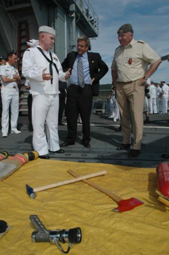 | Keywords: US Navy 060703-N-2456S-554 Damage Controlman 2nd Class Bruce Gordon explains to United States Ambassador to the Kingdom of Norway Benson K. Whitney how the guided-missile cruiser USS Monterey (CG 61) fights shipboard fires.jpg en Oslo Norway July 3 2006 - Damage Controlman 2nd Class Bruce Gordon explains to United States Ambassador to the Kingdom of Norway Benson K Whitney and Norway's Chief of Defense Norwegian Army General Suerre Dieson how the guided-missile cruiser USS Monterey CG 61 fights shipboard fires while out to sea Monterey recently completed the Neptune Warrior Course and earned its certification for their six-month deployment later this year U S Navy photo by Mass Communication Specialist Seaman Apprentice John Suits RELEASED 2006-07-03 060703-N-2456S-554 Navy http //www navy mil/view_image asp id 36425 U S Navy photo by Mass Communication Specialist Seaman Apprentice John Suits PD-USGov-Military-Navy Images from US Navy location Oslo Norway Damage Controlman Neptune Warrior 06-2 Generals of Norway Benson Whitney |