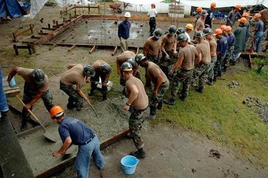 Keywords: US Navy 060726-N-0553R-002 Philippine Navy Seabees and U.S. Navy Seabees assigned to Naval Mobile Construction Battalion One (NMCB-1) form a bucket brigade to transfer concrete.jpg en San Fernando Philippines July 26 2006 - Philippine Navy Seabees and U S Navy Seabees assigned to Naval Mobile Construction Battalion One NMCB-1 form a bucket brigade to transfer concrete from the truck to the pad during a concrete placement in San Fernando NMCB-1 deployed 23 Seabees to the Philippines to participate in CARAT 2006 and to work and train with the Philippine Seabees The Seabees while deployed to the Philippines will construct two classrooms for the Mabanengbeng Elementary School U S Navy photo by Mass Communication Specialist 3rd Class Ja'lon A Rhinehart RELEASED 2006-07-26 060726-N-0553R-002 Navy http //www navy mil/view_image asp id 38359 U S Navy photo by Mass Communication Specialist 3rd Class Ja'lon A Rhinehart PD-USGov-Military-Navy Images from US Navy location Bacnotan Philippines |