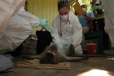 | Keywords: US Navy 060815-N-3153C-136 Army Spc. Becky Holmbeck, a veterinarian technician attached to the Medical Treatment Facility aboard the Military Sealift Command (MSC) hospital ship USNS Mercy (T-AH 19), draws blood for testing fro.jpg en Tarakan Indonesia Aug 15 2006 - Army Spc Becky Holmbeck a veterinarian technician attached to the Medical Treatment Facility aboard the Military Sealift Command MSC hospital ship USNS Mercy T-AH 19 draws blood for testing from a macaque monkey at a local wildlife reserve Mercy is currently off the coast to provide humanitarian and civic assistance to the people of this small island Mercy is in the fourth month of her five-month humanitarian and civic assistance deployment to South and Southeast Asia where her crew has already treated thousands of people U S Navy photo by Mass Communication Specialist Seaman Ryan Clement RELEASED 2006-08-15 060815-N-3153C-136 Navy http //www navy mil/view_image asp id 38042 U S Navy photo by Mass Communication Specialist Seaman Ryan Clement PD-USGov-Military-Navy Images from US Navy location Tarakan Indonesia |