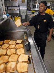 MAKE A MEME View Large Image Navy 060822-N-4856C-052 Culinary Specialist 3rd Class James M. Freeman prepares grilled ham and cheese sandwiches in the chief petty officers galley aboard the amphibious assault ship USS Iwo Jima (LHD 7).jpg en Red Sea Aug 21 2006 - ...
