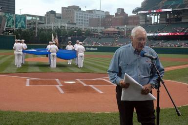 Keywords: US Navy 060830-N-1805P-005 Major League Baseball Hall of Fame Inductee and World War II Navy veteran Bob Feller accepts a Cleveland Indians Chief Wahoo logo flag presented to him by amphibious transport dock ship USS Cleveland.jpg en Cleveland Ohio Aug 30 2006 - Major League Baseball Hall of Fame Inductee and World War II Navy veteran Bob Feller accepts a Cleveland Indians Chief Wahoo logo flag presented to him by amphibious transport dock ship USS Cleveland LPD 7 Commanding Officer Capt Frank McCulloch during a ceremony before the start of the Major League Baseball game between the Indians vs Toronto Blue Jays The flag had been flown aboard the USS Cleveland for nearly a decade and in gratitude Feller presented McCulloch and other Cleveland Sailors with a new Indians flag on behalf of the city of Cleveland and Indians organization Cleveland Sailors are in their ship's namesake town for Cleveland Navy Week festivities Twenty-six such Navy Weeks are planned this year in cities throughout the U S arranged by the Navy Office of Community Outreach NAVCO The mission of NAVCO is to enhance the Navy's brand image in areas with limited exposure to the Navy U S Navy photo by Mass Communication Specialist 1st Class Jason J Perry RELEASED 2006-08-30 060830-N-1805P-005 Navy http //www navy mil/view_image asp id 38687 U S Navy photo by Mass Communication Specialist 1st Class Jason J Perry PD-USGov-Military-Navy USS Cleveland LPD-7 Bob Feller Progressive Field Images from US Navy location Cleveland Ohio Cleveland Navy Week