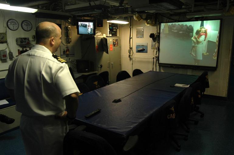 | Keywords: US Navy 060906-N-8854R-012 Lt. Cmdr. Andrew Tuttle says hello to his wife and daughter over video teleconferencing aboard USS Kitty Hawk (CV 63) after being the promoting officer for his wife's promotion ceremony.jpg en East China Sea Sept 6 2006 - Lt Cmdr Andrew Tuttle says hello to his wife and daughter over video teleconferencing aboard USS Kitty Hawk CV 63 after being the promoting officer for his wife's promotion to lieutenant commander Currently under way in the 7th Fleet area of responsibility Kitty Hawk demonstrates power projection and sea control as the U S Navy's only permanently forward-deployed aircraft carrier U S Navy photo by Mass Communication Specialist Seaman Matthew Reinhardt RELEASED 2006-09-06 060906-N-8854R-012 Navy http //www navy mil/view_image asp id 38977 U S Navy photo by Mass Communication Specialist Seaman Matthew Reinhardt PD-USGov-Military-Navy Aboard USS Kitty Hawk CV-63 |