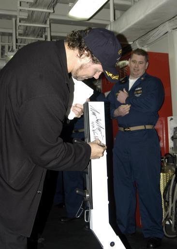 | Keywords: US Navy 061014-N-0730W-078 Magnus ver Magnusson, Four Time World's Strongest Man, autographs a workout bench in the gym aboard the multipurpose amphibious assault ship USS Wasp (LHD 1).jpg en Reykjavik Iceland Oct 14 2006 - Magnus ver Magnusson Four Time World's Strongest Man autographs a workout bench in the gym aboard the multipurpose amphibious assault ship USS Wasp LHD 1 Wasp is the first U S Navy ship to visit Iceland after the closing of the Naval Air Station in Keflavik U S Navy photo by Mass Communication Specialist 3rd Class Sarah West RELEASED 2006-10-14 061014-N-0730W-078 Navy http //www navy mil/view_image asp id 40036 U S Navy photo by Mass Communication Specialist 3rd Class Sarah West PD-USGov-Military-Navy Images from US Navy location Reykjavik Iceland Magnús Ver Magnússon |