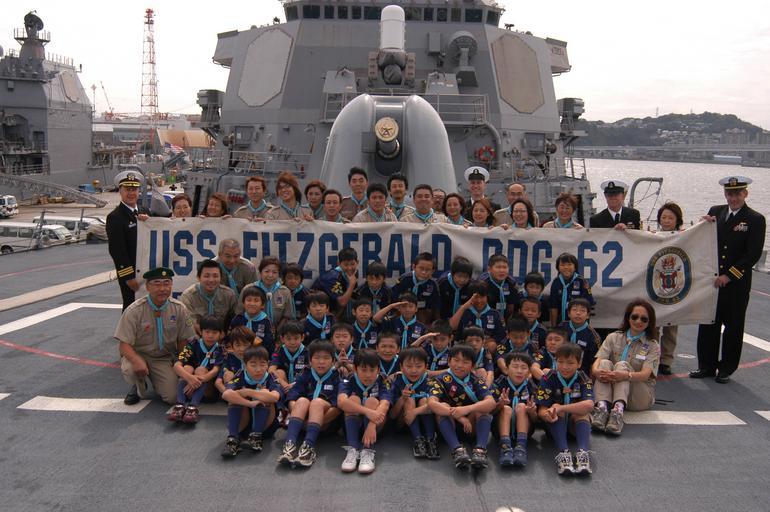 Keywords: US Navy 061015-N-5334H-179 USS Fitzgerald (DDG 62) Commanding Officer, Cmdr. David Hughes and Executive Officer, Lt. Cmdr. John Tolg hold up the ship's banner with children and adults from the Cub Scouts Tokyo Group.jpg en Yokosuka Japan Oct 15 2006 - USS Fitzgerald DDG 62 Commanding Officer Cmdr David Hughes and Executive Officer Lt Cmdr John Tolg hold up the ship s banner with children and adults from the Cub Scouts Tokyo Group 4 who were given a guided tour of ship More than 50 Cub Scouts and adults enjoyed a tour of the officer s wardroom the ship s bridge and the combat information center U S Navy photo by Mass Communication Specialist 3rd Class David J Hewitt RELEASED 2006-10-15 061015-N-5334H-179 Navy http //www navy mil/view_image asp id 40004 U S Navy photo by Mass Communication Specialist 3rd Class David J Hewitt PD-USGov-Military-Navy United States Fleet Activities Yokosuka Aboard USS Fitzgerald DDG-62 Cub Scouts Naval gun turrets Scouting in Japan |