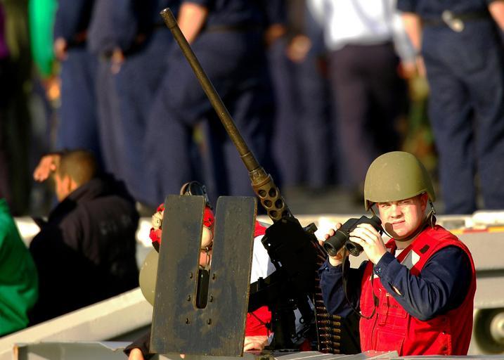 Keywords: US Navy 061022-N-0490C-003 Aviation Ordnanceman Airman Anthony Baka stands a force protection watch off the ship^rsquo,s flight deck aboard the Nimitz-class aircraft carrier USS Dwight D. Eisenhower (CVN 69), while transiting t.jpg en Mediterranean Sea Oct 22 2006 Aviation Ordnanceman Airman Anthony Baka stands a force protection watch off the ship s flight deck aboard the Nimitz-class aircraft carrier USS Dwight D Eisenhower CVN 69 while transiting the Strait of Messina Dwight D Eisenhower flagship for Carrier Strike Group CSG 8 recently departed Naples Italy following a scheduled four-day port visit Eisenhower departed her homeport of Norfolk Va on Oct 3 for a regularly scheduled deployed in support of Maritime Security Operations MSO Embarked aboard IKE are aircraft assigned to Carrier Air Wing CVW 7 U S Navy photo by Mass Communication Specialist 2nd Class Miguel Angel Contreras RELEASED 2006-10-22 061022-N-0490C-003 Navy http //www navy mil/view_image asp id 40119 U S Navy photo by Mass Communication Specialist 2nd Class Miguel Angel Contreras PD-USGov-Military-Navy Aviation Ordnanceman Aboard USS Dwight D Eisenhower CVN-69 |