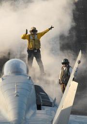 | Keywords: US Navy 061023-N-4776G-205 An aviation boatswain's mate (handler) directs an F-A-18 Hornet into its launch position during flight operations on the flight deck aboard the Nimitz-class aircraft carrier USS Ronald Reagan (CVN 76).jpg en Pacific Ocean Oct 23 2006 An aviation boatswain's mate handler directs an F/A-18 Hornet into its launch position during flight operations on the flight deck aboard the Nimitz-class aircraft carrier USS Ronald Reagan CVN 76 Reagan is currently conducting Fleet Replacement Squadron Carrier Qualifications FRSCQ in the southern California operating area U S Navy photo by Mass Communication Specialist Seaman Kathleen Gorby RELEASED 2006-10-23 061023-N-4776G-205 Navy http //www navy mil/view_image asp id 40219 U S Navy photo by Mass Communication Specialist Seaman Kathleen Gorby PD-USGov-Military-Navy Aviation Boatswain's Mates Handlers F/A-18 Hornet launches from USS Ronald Reagan CVN-76 F/A-18 Hornet on flight decks Steam catapults |