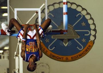 Keywords: US Navy 061212-N-5330L-016 Jermaine Brown, a member of the Harlem Globetrotters, hangs around after a slam-dunk near the end of the Globetrotters' game against the New York Nationals aboard Nimitz-class aircraft carrier USS Dwi.jpg en Persian Gulf Dec 12 2006 - Jermaine Brown a member of the Harlem Globetrotters hangs around after a slam-dunk near the end of the Globetrotters' game against the New York Nationals aboard Nimitz-class aircraft carrier USS Dwight D Eisenhower CVN 69 The Globetrotters visited Eisenhower as part of their 21-day Morale Welfare and Recreation tour of the Middle East in an effort to show their thanks to the men and women of the military for the sacrifices they make to defend freedom in the area Eisenhower and embarked Carrier Air Wing Seven CVW-7 are on a regularly scheduled deployment currently operating in support of Maritime Security Operations and the global war on terrorism U S Navy photo by Mass Communication Specialist 3rd Class Matthew D Leistikow RELEASED 2006-12-12 061212-N-5330L-016 Navy http //www navy mil/view_image asp id 41582 U S Navy photo by Mass Communication Specialist 3rd Class Matthew D Leistikow PD-USGov-Military-Navy Aboard USS Dwight D Eisenhower CVN-69 |