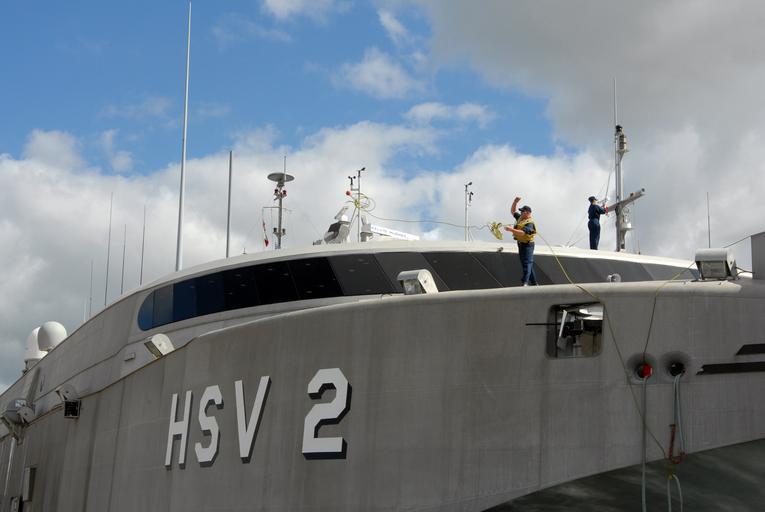 Keywords: US Navy 070125-N-4965F-010 A Sailor assigned to U.S. Navy High-Speed Vessel (HSV-2) Swift throws a mooring line to a line handler on the pier as she moors at Naval Station Pearl Harbor.jpg en Pearl Harbor Hawaii Jan 25 2007 - A Sailor assigned to U S Navy High-Speed Vessel HSV-2 Swift throws a mooring line to a line handler on the pier as she moors at Naval Station Pearl Harbor Swift is currently in port at Naval Station Pearl Harbor for routine maintenance U S Navy photo by Mass Communication Specialist 1st Class James E Foehl RELEASED 2007-01-25 070125-N-4965F-010 Navy http //www navy mil/view_image asp id 42466 U S Navy photo by Mass Communication Specialist 1st Class James E Foehl PD-USGov-Military-Navy Exterior of HSV-2 Swift HSV-2 Swift at Pearl Harbor