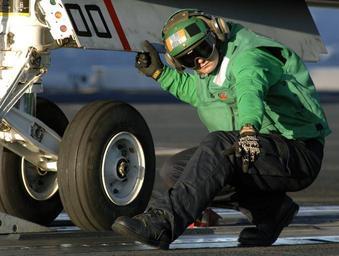 | Keywords: US Navy 070127-N-5345W-080 An aviation boatswain's mate signals to taxi forward an S-3B Viking in order to set the launch bar into the catapult shuttle during flight operations on board Nimitz-class aircraft carrier USS Harry S.jpg en Atlantic Ocean Jan 27 2007 - An aviation boatswain's mate signals to taxi forward an S-3B Viking assigned to the Checkmates of Sea Control Squadron Two Two VS-22 in order to set the launch bar into the catapult shuttle during flight operations on board Nimitz-class aircraft carrier USS Harry S Truman CVN 75 Truman is currently underway conducting flight deck certification in the Atlantic Ocean U S Navy photo by Mass Communication Specialist 3rd Class Kristopher Wilson RELEASED 2007-01-27 070127-N-5345W-080 Navy http //www navy mil/view_image asp id 42582 U S Navy photo by Mass Communication Specialist 3rd Class Kristopher Wilson PD-USGov-Military-Navy Aviation Boatswain's Mates Equipment Aboard USS Harry S Truman CVN-75 |