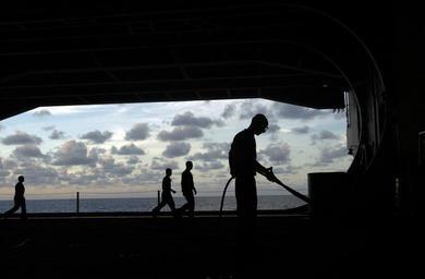 View Original:US_Navy_070206-N-9712C-002_Airman_Aaron_Rimer,_uses_an_air_hose_to_clean_out_the_pad-eyes_in_the_hanger_bay_of_Nimitz-class_aircraft_carrier_USS_Ronald_Reagan_(CVN_76).jpg (2000x1312)
