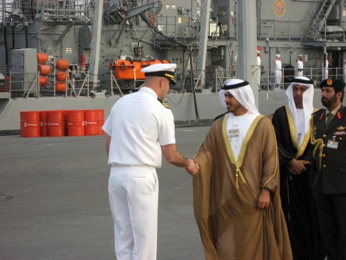 View Original:US_Navy_070219-N-0000O-001_Cmdr._Scott_Davies,_commander,_Mine_Countermeasures_Division_(MCMDIV)_31,_greets_Sheikh_Sultan_bin_Tahnoon_Al_Nahyan,_chairman_of_Abu_Dhabi_Tourism_Authority.jpg (2816x2112)