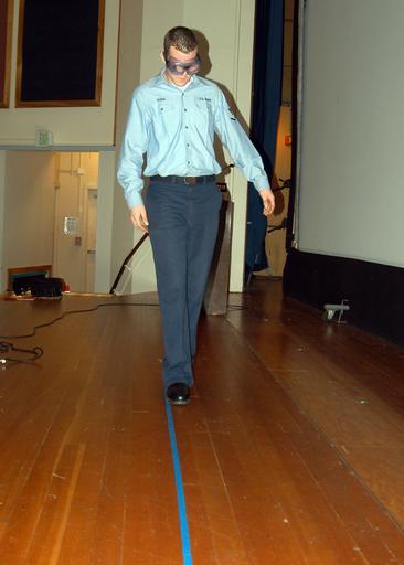 Keywords: US Navy 070309-N-6247M-023 Aircrew Survival Equipmentman 3rd Class James Sloan, assigned to Naval Air Station Whidbey Island, performs a sobriety test at impaired driving training.jpg en OAK HARBOR Wash March 9 2007 - Aircrew Survival Equipmentman 3rd Class James Sloan assigned to Naval Air Station Whidbey Island performs a sobriety test at impaired driving training The goggles Sloan wore simulate impairment The Impaired Driving Impact Panel of Island County gave a training seminar for Whidbey Sailors at the Sky Warrior Theater on Naval Air Station Whidbey Island U S Navy photo by Mass Communication Specialist 1st Class Bruce McVicar RELEASED 2007-03-09 070309-N-6247M-023 Navy http //www navy mil/view_image asp id 43908 U S Navy photo by Mass Communication Specialist 1st Class Bruce McVicar PD-USGov-Military-Navy Naval Air Station Whidbey Island Aircrew Survival Equipmentman Field sobriety tests |