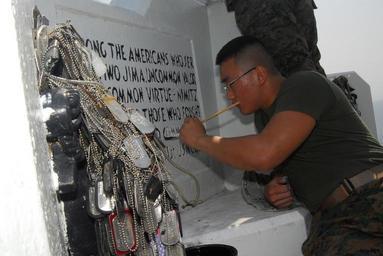 Keywords: US Navy 070313-N-4124C-104 Lance Cpl. Hanmo L. Broker, assigned to Marine Corps Base Okinawa, gives a fresh coat of paint to an inscription at a shrine dedicated to the service members who fought in the Battle of Iwo Jima.jpg en IWO JIMA Japan March 13 2007 - Lance Cpl Hanmo L Broker assigned to Marine Corps Base Okinawa gives a fresh coat of paint to an inscription at a shrine dedicated to the service members who fought in the Battle of Iwo Jima Dock landing ship USS Harpers Ferry LSD 49 is visiting the island to support the 62nd Commemoration of the Battle of Iwo Jima In conjunction with the commemoration Sailors and Marines had the opportunity to see historical remnants of the World War II battle and to honor fallen service members of both forces U S Navy photo by Mass Communication Specialist 2nd Class Adam R Cole RELEASED 2007-03-13 070313-N-4124C-104 Navy http //www navy mil/view_image asp id 43950 U S Navy photo by Mass Communication Specialist 2nd Class Adam R Cole PD-USGov-Military-Navy Mount Suribachi Memorial Aboard USS Harpers Ferry LSD-49 Inscriptions in Japan People painting |