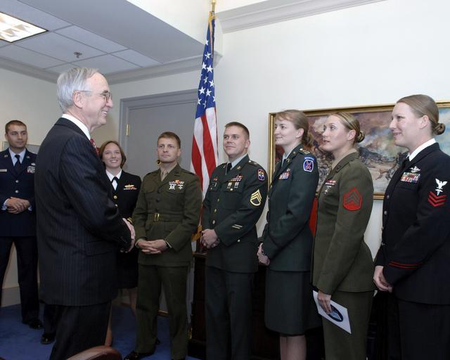 | Keywords: US Navy 070330-D-2987S-070 Deputy Secretary of Defense Gordon England meets with.jpg en WASHINGTON D C March 30 2007 - Deputy Secretary of Defense Gordon England meets with Why We Serve military speakers at the Pentagon prior to their 90-day tour Why We Serve is an outreach program designed to assist communities in locating uniformed members of the Armed Forces to speak about the nobility of service and share their personal experiences with the American people Community organizations business associations academic institutions veterans groups and other non-profit or non-partisan organizations requesting a speaker from Why We Serve can look forward to hearing from a service member who has recently returned from Afghanistan Iraq or the Horn of Africa DoD photo by Helene C Stikkel RELEASED 2007-03-30 070330-D-2987S-070 Navy http //www navy mil/view_image asp id 44763 U S Navy photo PD-USGov-Military-Navy People of the United States Navy Gordon R England |