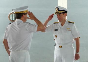 Keywords: US Navy 070404-N-8560S-004 French Navy Rear Adm. Alain Hinden, left, reports to Commander, U.S. Naval Forces Central Command-U.S. 5th Fleet Vice Adm. Kevin Cosgriff during a change of control ceremony.jpg en MINA SALMAN Bahrain April 4 2007 - French Navy Rear Adm Alain Hinden left reports to Commander U S Naval Forces Central Command/U S 5th Fleet Vice Adm Kevin Cosgriff during a change of control ceremony aboard French Afloat Support Ship FS Somme A 631 Hinden relieved Royal Navy Commodore Bruce Williams as Commander Task Force 150 during the ceremony U S Navy photo by Mass Communication Specialist 2nd Class Christopher T Smith RELEASED 2007-04-04 070404-N-8560S-004 Navy http //www navy mil/view_image asp id 44731 U S Navy photo by Mass Communication Specialist 2nd Class Christopher T Smith PD-USGov-Military-Navy US Navy in Mina Salman Bahrain Change of command Kevin Cosgriff Admirals of France Salutes A631 Somme ship 1990 |