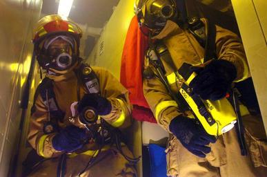 Keywords: US Navy 070404-N-7130B-187 A firefighting team assigned to the Nimitz-Class aircraft carrier USS Ronald Reagan (CVN 76) Repair Locker Seven Fox (7F) combats a simulated fire during a general quarters drill aboard the ship.jpg en SOUTH CHINA SEA April 4 2007 - A firefighting team assigned to the Nimitz-Class aircraft carrier USS Ronald Reagan CVN 76 Repair Locker Seven Fox 7F combats a simulated fire during a general quarters drill aboard the ship Training evolutions are an important part of shipboard life; they ensure Sailors maintain proficiency in critical mission areas such as firefighting and damage control The Ronald Reagan Carrier Strike Group CSG is underway in the Pacific Ocean on a surge deployment in support of U S military operations in the Western Pacific U S Navy photo by Mass Communication Specialist 2nd Class Aaron Burden RELEASED 2007-04-04 070404-N-7130B-187 Navy http //www navy mil/view_image asp id 44755 U S Navy photo by Mass Communication Specialist 2nd Class Aaron Burden PD-USGov-Military-Navy Firefighting training on USS Ronald Reagan CVN-76 |
