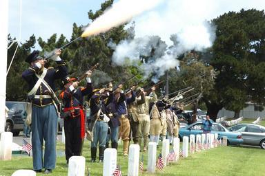 Keywords: US Navy 070528-N-4658L-132 Members of the Frontier Army of the West.jpg en POINT LOMA Calif May 28 2007 Members of the Frontier Army of the West I Company 2nd U S Calvary render a 21 gun salute during the Veterans Memorial Day Committee 107th Memorial Service and Day of Remembrance Ceremony at Fort Rosecrans National Cemetery The ceremony was organized to pay tribute and recognize U S veterans from The Revolutionary War up to the Gulf War for the outstanding service and sacrifice during the Memorial Day weekend U S Navy photo by Mass Communication Specialist 2nd Class Mark A Leonesio RELEASED 2007-05-28 070528-N-4658L-132 Navy http //www navy mil/view_image asp id 46687 U S Navy photo by Mass Communication Specialist 2nd Class Mark A Leonesio PD-USGov-Military-Navy Fort Rosecrans National Cemetery 21 gun salute Muzzle flashes of firearms |