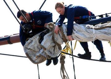 Keywords: US Navy 070530-N-2893B-001 About 100 feet above the deck of USS Constitution, Yeoman 1st Class Rob Santiago and Seaman Nola Sparks bend a 500-lb., 158-square yard cotton canvas sail.jpg en CHARLESTOWN Mass May 30 2007 - About 100 feet above the deck of USS Constitution Yeoman 1st Class Rob Santiago and Seaman Nola Sparks bend a 500-lb 158-square yard cotton canvas sail to the ship's portside mizzenmast topsail yard About 20 Sailors spent several hours on May 30 2007 rigging the first of six sails to the 2 200-ton three-masted wooden frigate readying Old Ironsides for two underway demonstrations this summer USS Constitution is - at 209 years old - the oldest commissioned warship afloat in the world manned by 64 active duty U S Navy Sailors and visited by nearly half a million tourists annually U S Navy photo by Mass Communication Specialist 1st Class SW Eric Brown RELEASED 2007-05-30 070530-N-2893B-001 Navy http //www navy mil/view_image asp id 46976 U S Navy photo by Mass Communication Specialist 1st Class SW Eric Brown PD-USGov-Military-Navy Military in Massachusetts USS Constitution in 21st century Sailors aloft |