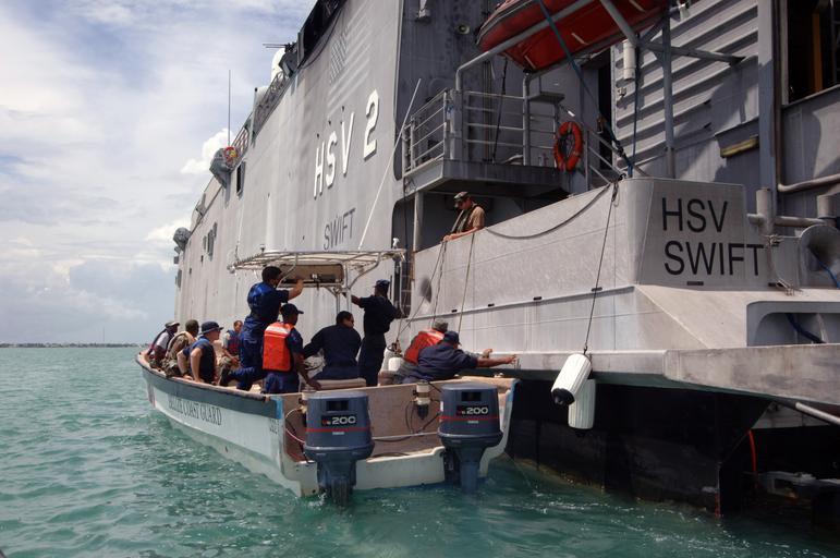 Keywords: US Navy 070611-N-0989H-024 U.S. service members from the Expeditionary Training Command and Coast Guard International Training Division conduct a vessel assessment aboard a Belizean Coast Guard boat.jpg en BELIZE CITY Belize June 11 2007 - U S service members from the Expeditionary Training Command and Coast Guard International Training Division conduct a vessel assessment aboard a Belizean Coast Guard boat prior to commencing coxswain subject matter exchanges on board High Speed Vessel HSV 2 Swift Task Group 40 9 TG 40 9 is deployed as part of the pilot Global Fleet Station GFS to the Caribbean basin and Central America The mission is designed to validate the GFS concept for the Navy and support U S Southern Command objectives for its area of responsibility by enhancing cooperative partnerships with regional maritime services and improving operational readiness for the participating partner nations U S photo by Mass Communication Specialist 1st Class David Hoffman RELEASED 2007-06-11 070611-N-0989H-024 Navy http //www navy mil/view_image asp id 49029 U S Navy photo PD-USGov-Military-Navy United States Navy in Belize City Exterior of HSV-2 Swift |
