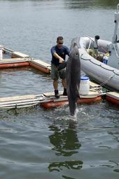 Keywords: US Navy 070613-N-7676W-177 Aviation Structural Mechanic 2nd Class Shaun McDonald, assigned to Naval Special Clearance Team One (NSCT-1), works with Ten, a Marine Mammal System (MMS) dolphin.jpg en PANAMA CITY Fla June 13 2007 - Aviation Structural Mechanic 2nd Class Shaun McDonald assigned to Naval Special Clearance Team One NSCT-1 works with Ten a Marine Mammal System MMS dolphin during a demonstration as part of Autonomous Underwater Vehicle AUV Fest 2007 Sponsored by the Office of Naval Research ONR AUV Fest is the largest in-water demonstration of unmanned underwater surface air and ground vehicles ever conducted U S Navy photograph by Mr John F Williams RELEASED 2007-06-13 070613-N-7676W-177 Navy http //www navy mil/view_image asp id 47144 U S Navy photo PD-USGov-Military-Navy Images from US Navy location PANAMA CITY Fla Aviation Structural Mechanic United States Navy Marine Mammal Program People with sea mammals Tursiops truncatus captive United States Naval Special Clearance Team One |