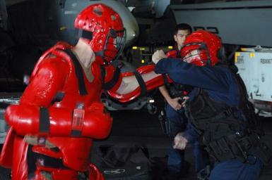 Keywords: US Navy 070620-N-7883G-016 Sailors practice baton striking skills using a.jpg en CORAL SEA June 20 2007 - Sailors practice baton striking skills using a red man training gear aboard USS Kitty Hawk CV 63 Twelve Kitty Hawk Sailors are undergoing a three-week training course to become members of the ship's force protection team Kitty Hawk Carrier Strike Group is participating in exercise Talisman Saber 2007 in the Coral Sea near the coast of Australia U S Navy photo by Mass Communication Specialist Seaman Kyle D Gahlau RELEASED 2007-06-20 070620-N-7883G-016 Navy http //www navy mil/view_image asp id 47365 U S Navy photo by Mass Communication Specialist Seaman Kyle D Gahlau PD-USGov-Military-Navy Aboard USS Kitty Hawk CV-63 Talisman Sabre 2007 |