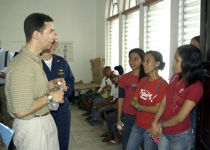Keywords: US Navy 070622-N-6410J-037 Mr. Todd Harvey, Principal Director, Assistant Secretary of Defense for Partnership Strategy, speaks with three local medical students.jpg en LEGASPI Philippines June 22 2007 - Mr Todd Harvey Principal Director Assistant Secretary of Defense for Partnership Strategy speaks with three local medical students during a visit to the city's hospital Amphibious assault ship USS Peleliu LHA 5 is in the area working with the Philippine government and non-governmental organizations and partner nations to offer medical care as well as construction and engineering projects during Pacific Partnership 2007 U S Navy photo by Mass Communication Specialist Seaman Matthew Jackson RELEASED 2007-06-22 070622-N-6410J-037 Navy http //www navy mil/view_image asp id 47459 U S Navy photo by Mass Communication Specialist Seaman Matthew Jackson PD-USGov-Military-Navy Images from US Navy location LEGASPI Philippines |