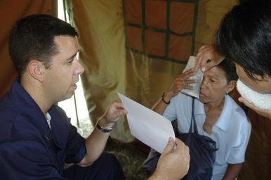 Keywords: US Navy 070702-N-1752H-110 Cmdr. Matthew Behil performs a routine eye examination on a local patient during a medical civic affairs program (MEDCAP) held at Tabaco Elementary School.jpg en TABACO CITY Philippines July 2 2007 - Cmdr Matthew Behil performs a routine eye examination on a local patient during a medical civic affairs program MEDCAP held at Tabaco Elementary School The MEDCAP is being conducted throughout the region in support of Pacific Partnership 2007 a four-month humanitarian assistance mission to Southeast Asia and Oceania that will include specialized medical care and various construction and engineering projects The various civic action programs assist the Philippines in providing local communities with a wide range of services U S Navy photo by Mass Communication Specialist Seaman Patrick D House RELEASED 2007-07-02 070702-N-1752H-110 Navy http //www navy mil/view_image asp id 47846 U S Navy photo by Mass Communication Specialist Seaman Patrick D House PD-USGov-Military-Navy Tabaco City Inspection medicine |