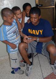 Keywords: US Navy 070704-N-9486C-001 Master-at-Arms 1st Class Jermaine Bing shares his music with children at the La Casa Rosada home for Dominican children with HIV.jpg en SANTO DOMINGO Dominican Republic July 4 2007 - Master-at-Arms 1st Class Jermaine Bing shares his music with children at the La Casa Rosada home for Dominican children with HIV Bing is attached to Task Group 40 9 which is deployed as part of the pilot Global Fleet Station GFS to the Caribbean basin and Central America The mission is designed to validate the GFS concept for the Navy and support U S Southern Command objectives for its area of responsibility U S Navy photo by Mass Communication Specialist 1st Class Cynthia Clark RELEASED 2007-07-04 070704-N-9486C-001 Navy http //www navy mil/view_image asp id 48262 U S Navy photo by Mass Communication Specialist 1st Class Cynthia Clark PD-USGov-Military-Navy Images from US Navy location Santo Domingo Dominican Republic Master-at-arms |