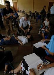 Keywords: US Navy 070729-N-6278K-190 Lupe Diaz, a Project Hope certified nurse midwife, and Bob Leitch, medical director for the Project Hope detachment aboard Military Sealift Command hospital ship USNS Comfort (T-AH 20), demonstrate fi.jpg en ACAJUTLA El Salvador July 29 2007 Lupe Diaz a Project Hope certified nurse midwife and Bob Leitch medical director for the Project Hope detachment aboard Military Sealift Command hospital ship USNS Comfort T-AH 20 demonstrate first-aid techniques to community health care workers at Casa Comunal Comfort is on a four-month humanitarian deployment to Latin America and the Caribbean to provide medical treatment to patients in a dozen countries U S Navy photo by Mass Communication Specialist 2nd Class Joan E Kretschmer RELEASED 2007-07-29 070729-N-6278K-190 Navy http //www navy mil/view_image asp id 48850 U S Navy photo by Mass Communication Specialist 2nd Class Joan E Kretschmer PD-USGov-Military-Navy Acajutla Education in El Salvador USNS Comfort in El Salvador 2007 |