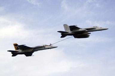 Keywords: US Navy 070917-N-5387K-033 An F-A-18E Super Hornet, attached to the Royal Maces of Strike Fighter Squadron (VFA) 27, refuels another Super Hornet over USS Kitty Hawk (CV 63) during a practice air show.jpg en SOUTH CHINA SEA Sept 17 2007 - An F/A-18E Super Hornet attached to the Royal Maces of Strike Fighter Squadron VFA 27 refuels another Super Hornet over USS Kitty Hawk CV 63 during a practice air show The practice air show was done in preparation for Kitty Hawk's upcoming friends and family day cruise Kitty Hawk is more than three months into her summer deployment from Fleet Activities Yokosuka Japan U S Navy photo by Mass Communication Specialist 3rd Class Juan Antoine King RELEASED 2007-09-17 070917-N-5387K-033 Navy http //www navy mil/view_image asp id 50965 U S Navy photo by Mass Communication Specialist 3rd Class Juan Antoine King PD-USGov-Military-Navy Aboard USS Kitty Hawk CV-63 Aerial refueling by F/A-18E Super Hornet Aerial refueling of F/A-18E Super Hornet Strike Fighter Squadron 27 United States Navy |