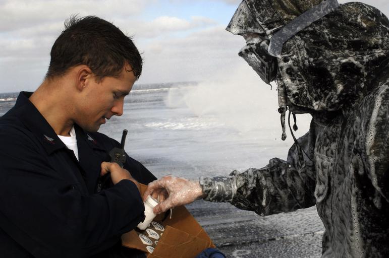 Keywords: US Navy 071030-N-4133B-064 Damage Controlman Fireman Ryan Anderson hands a sample of aqueous film forming foam (AFFF) to Damage Controlman 2nd Class William Koziol aboard Nimitz-class aircraft carrier USS Ronald Reagan (CVN 76).jpg en PACIFIC OCEAN Oct 30 2007 - Damage Controlman Fireman Ryan Anderson hands a sample of aqueous film forming foam AFFF to Damage Controlman 2nd Class William Koziol aboard Nimitz-class aircraft carrier USS Ronald Reagan CVN 76 while conducting a test of the ship's countermeasure washdown and AFFF Ronald Reagan is conducting sea trials one of the final phases of the ship's current planned incremental availability U S Navy photo by Mass Communication Specialist Seaman Benjamin Brossard RELEASED 2007-10-30 071030-N-4133B-064 Navy http //www navy mil/view_image asp id 52314 U S Navy photo by Mass Communication Specialist Seaman Benjamin Brossard PD-USGov-Military-Navy Aqueous Film Forming Foam Wash-down system tests of USS Ronald Reagan CVN-76 Damage Controlman |