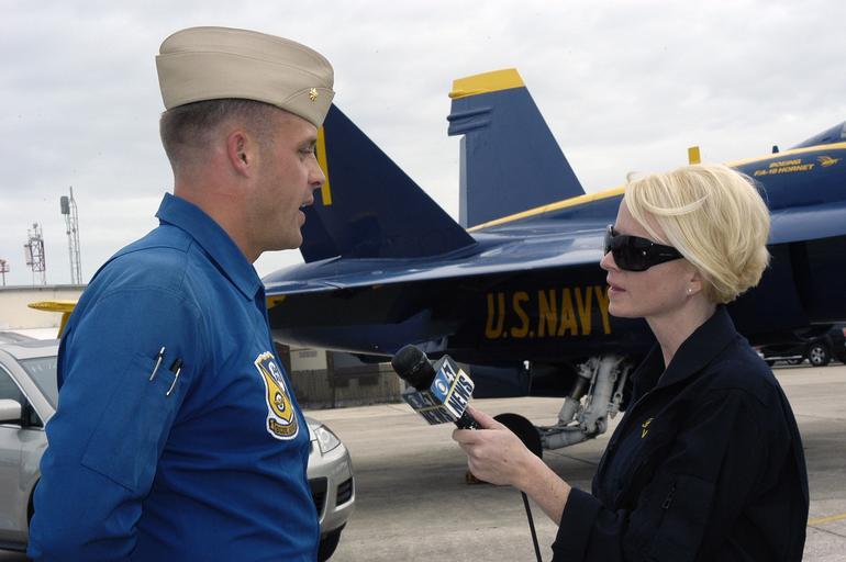 Keywords: US Navy 071031-N-8102J-043 CBS television reporter Celine McArthur interviews Blue Angel's pilot Marine Corps Maj. Nathan Miller, ^7 pilot of the Blue Angels, prior to her media ride in a Blue Angels F-A-18 Hornet.jpg en MAYPORT Fla Oct 31 2007 - CBS television reporter Celine McArthur interviews Blue Angel's pilot Marine Corps Maj Nathan Miller 7 pilot of the Blue Angels prior to her media ride in a Blue Angels F/A-18 Hornet The Blue Angels are in Jacksonville Fla for the 2007 Sea and Sky Spectacular Nov 2-4 celebrating the 232nd birthday of the United States Navy and honoring the men and women who served and continue to wear the military uniform with pride U S Navy photo by Mass Communication Specialist 1st Class Toiete Jackson RELEASED 2007-10-31 071031-N-8102J-043 Navy http //www navy mil/view_image asp id 52351 U S Navy photo by Mass Communication Specialist 1st Class Toiete Jackson PD-USGov-Military-Navy Naval Station Mayport Side caps CBS Blue Angels pilots and team Interviews in the United States Reporters