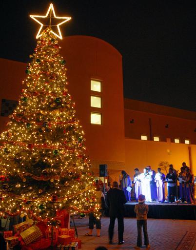 | Keywords: US Navy 071202-N-0413B-002 The Naval Support Activity Bahrain Chapel Choir performs at the Christmas tree lighting celebration.jpg en BAHRAIN Dec 2 2007 The Naval Support Activity Bahrain Chapel Choir performs at the Christmas tree lighting celebration The event started with a prayer by Commander Navy Region Southwest Asia's Chaplain Cmdr Aaron Jefferson followed by lighting of the tree U S Navy photo by Mass Communication Specialist 2nd Class Anderson Bomjardim Released - Five-pointed star of Bethlehem finial on the top 2007-12-02 071202-N-0413B-002 Navy http //www navy mil/view_image asp id 53449 U S Navy photo by Mass Communication Specialist 2nd Class Anderson Bomjardim PD-USGov-Military-Navy Artificial Christmas trees Luminous christmas stars Five-pointed stars as Christian symbol Gold star Christmas tree finials Star of Bethlehem Naval Support Activity Bahrain |