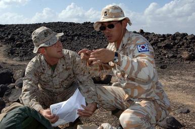 Keywords: US Navy 071204-N-3931M-078 Republic of Korea Army Maj. Youngjin Kim from Combined Joint Task Force Horn of Africa (CJTF-HOA) and U.S. Marine Corps Maj. Guy Ravey, discuss range operations at the Gordia bombing range off the coa.jpg en DJIBOUTI Africa Dec 4 2007 Republic of Korea Army Maj Youngjin Kim from Combined Joint Task Force Horn of Africa CJTF-HOA and U S Marine Corps Maj Guy Ravey discuss range operations at the Gordia bombing range off the coast of Djibouti during a bombing exercise conducted by F/A-18 Hornet aircraft from the Red Rippers of Strike Fighter Squadron VFA 11 embarked aboard USS Harry S Truman CVN-75 CJTF-HOA conducts operations in the region to prevent conflict promote regional stability and protect coalition interests U S Navy photo by Mass Communication Specialist 1st Class Michael R McCormick Released 2007-12-04 071204-N-3931M-078 Navy http //www navy mil/view_image asp id 53654 U S Navy photo by Mass Communication Specialist 1st Class Michael R McCormick PD-USGov-Military-Navy Gordia bombing range Taken with Nikon D2X People of the United States Marine Corps Military of South Korea