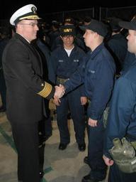 Keywords: US Navy 080111-N-8848T-001 Vice Adm. John C. Harvey Jr., Chief of Naval Personnel, congratulates recruits for successfully passing Battle Stations and receiving their Navy ballcaps at Recruit Training Command (NTC) at Naval Sta.jpg en GREAT LAKES Ill Jan 11 2008 Vice Adm John C Harvey Jr Chief of Naval Personnel congratulates recruits for successfully passing Battle Stations and receiving their Navy ballcaps at Recruit Training Command NTC at Naval Station Great Lakes Battle Stations is a grueling 12-hour series of scenarios where recruits are tested on teamwork and basic skills needed when they report to their first ship The drills simulate realistic shipboard emergencies from fire to flooding There are also simulated missile attacks line handling evolutions and mass casualty events All the scenarios are held aboard the Navy's latest simulator USS Trayer BST 21 a 210-foot-long mockup of an Arleigh Burke-class destroyer housed inside the USS Iowa complex U S Navy photo by Scott A Thornbloom Released 2008-01-11 080111-N-8848T-001 Navy http //www navy mil/view_image asp id 54496 U S Navy photo by Scott A Thornbloom PD-USGov-Military-Navy USS Trayer BST-21 Recruit Training Command Great Lakes Illinois Handshakes involving the military Males with baseball caps |