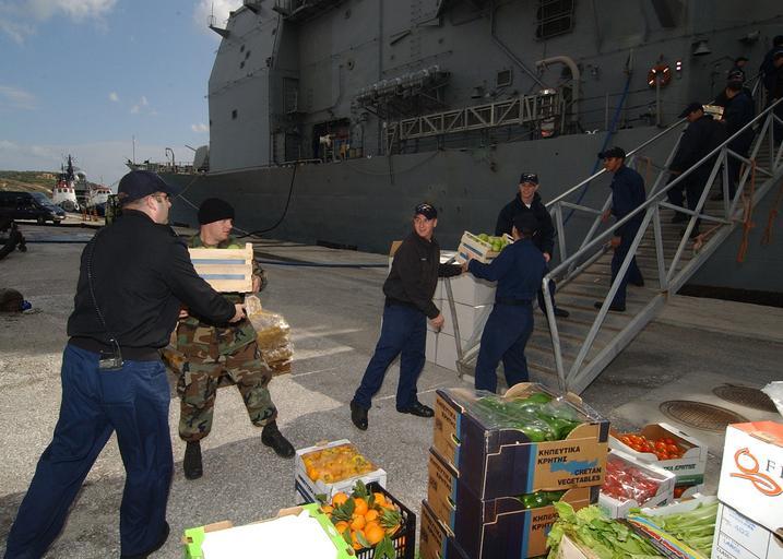 Keywords: US Navy 080128-N-0780F-006 Sailors move fresh fruits and vegetables onto the Ticonderoga-class guided-missile cruiser USS San Jacinto (CG 56) during a routine port visit.jpg en SOUDA BAY Greece Jan 28 2008 Sailors move fresh fruits and vegetables onto the Ticonderoga-class guided-missile cruiser USS San Jacinto CG 56 during a routine port visit San Jacinto departed Norfolk Va in November and is on deployment in the U S 6th Fleet area of responsibility U S Navy photo by Paul Farley Released 2008-01-28 080128-N-0780F-006 Navy http //www navy mil/view_image asp id 54902 U S Navy photo by Paul Farley PD-USGov-Military-Navy Naval Support Activity Souda Bay USS San Jacinto CG-56 |