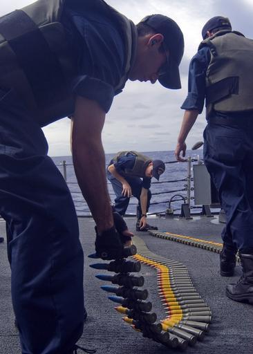 Keywords: US Navy 080216-N-5253W-001 Sailors aboard the Arleigh Burke-class guided-missile destroyer USS Fitzgerald (DDG 62) in preparation for a live-fire, small-craft action team (SCAT) drill while underway in the western Pacific.jpg en PACIFIC OCEAN Feb 16 2008 Sailors aboard the Arleigh Burke-class guided-missile destroyer USS Fitzgerald DDG 62 lay out belts of 25 mm ammunition for the MK-38 chain gun in preparation for a live-fire small-craft action team SCAT drill while underway in the western Pacific SCAT drills are designed to train crewmembers how to react in the event of a small-boat attack on the ship U S Navy photo by Mass Communication Specialist 3rd Class Gabriel S Weber Released 2008-02-16 080216-N-5253W-001 Navy http //www navy mil/view_image asp id 55413 U S Navy photo by Mass Communication Specialist 3rd Class Gabriel S Weber PD-USGov-Military-Navy People with ammunition belts Aboard USS Fitzgerald DDG-62 25 x 137 mm Taken with Nikon D100 |