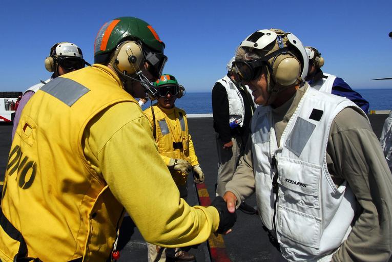 Keywords: US Navy 080621-N-0684R-008 Aircraft launching officer Lt. Edwin Bounds shakes hands with University of Southern California (USC) head football Coach, Pete Carroll on the flight deck aboard the Nimitz-class aircraft carrier USS.jpg en PACIFIC OCEAN June 21 2008 Aircraft launching officer Lt Edwin Bounds shakes hands with University of Southern California USC head football Coach Pete Carroll on the flight deck aboard the Nimitz-class aircraft carrier USS John C Stennis CVN 74 during flight operations Carroll is one of several USC alumni and staff visiting Stennis to thank Sailors and Marines for their service sacrifice and dedication to their country Stennis and multiple embarked fleet replacement squadrons are conducting fleet replacement squadron carrier qualifications FRSCQ off the coast of Southern California FRSCQ's are conducted to qualify naval aviators in day and night carrier operations for the first time in the aircraft they will fly during their aviation career U S Navy photo by Mass Communication Specialist 2nd Class Ron Reeves Released 2008-06-21 080621-N-0684R-008 Navy http //www navy mil/view_image asp id 60536 U S Navy photo by Mass Communication Specialist 2nd Class Ron Reeves PD-USGov-Military-Navy Aboard USS John C Stennis CVN-74 |