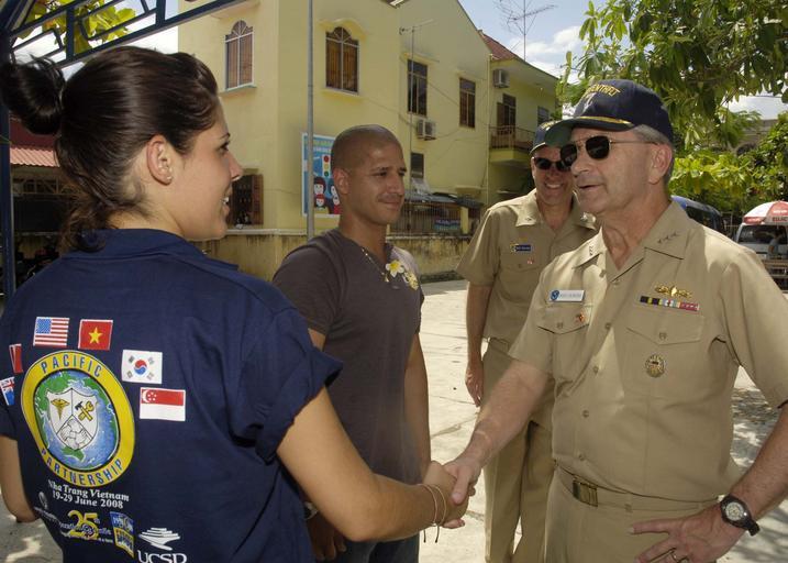 | Keywords: US Navy 080627-N-0209M-005 ice Adm. Doug Crowder, commander, U.S. 7th Fleet, shakes hands with Air Force Senior Airman Arianne J. Sanchez during a tour of the medical civic action program site.jpg en NHA TRANG Vietnam June 27 2008 Vice Adm Doug Crowder commander U S 7th Fleet shakes hands with Air Force Senior Airman Arianne J Sanchez during a tour of the medical civic action program site at the Dien Khanh Primary School Crowder interacted with local patients and spoke with the crew of the Military Sealift Command hospital ship USNS Mercy T-AH 19 The Pacific Partnership deployment to Vietnam continues to improve bilateral relations between the U S and Vietnam demonstrating our continued commitment to work together to address mutual issues and concerns This mission involves partnerships with the armed forces of Vietnam Vietnamese health care professionals and local government officials U S Navy photo by Mass Communication Specialist 3rd Class Joshua Martin Released 2008-06-27 080627-N-0209M-005 Navy http //www navy mil/view_image asp id 60747 U S Navy photo by Mass Communication Specialist 3rd Class Joshua Martin PD-USGov-Military-Navy Health in Nha Trang Aboard USNS Mercy T-AH-19 William Douglas Crowder Handshakes involving the military |