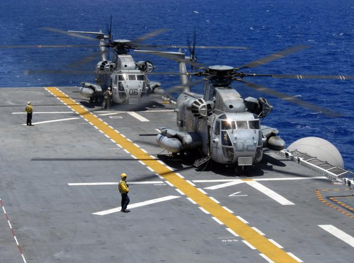 Keywords: US Navy 080711-N-9500T-132 Two CH-53 Sea Stallions idle on the flight deck of the amphibious assault ship USS Bonhomme Richard (LHD 6).jpg en KAUAI Hawaii July 11 2008 Two CH-53 Sea Stallions assigned to Marine Heavy Helicopter Squadron HMH 362 idle on the flight deck of the amphibious assault ship USS Bonhomme Richard LHD 6 after fly-on exercises during Rim of the Pacific RIMPAC 2008 RIMPAC is the world's largest multinational exercise and is scheduled biennially by the U S Pacific Fleet Participants include the U S Australia Canada Chile Japan Netherlands Peru Republic of Korea Singapore and the United Kingdom U S Navy photo by Mass Communication Specialist 2nd Class Scott Taylor/Released 2008-07-11 080711-N-9500T-132 Navy http //www navy mil/view_image asp id 61707 U S Navy photo PD-USGov-Military-Navy Marine Heavy Helicopter Squadron 362 Sikorsky CH-53A/D Sea Stallion U S Marine Corps Aboard USS Bonhomme Richard LHD-6 |
