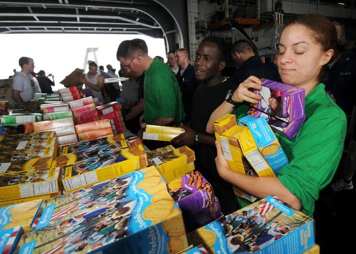 Keywords: US Navy 080726-N-9898L-009 Aviation Machinist's Mate Airman Ashley Schumm picks up boxes of cookies from Girl Scouts participating in Operation Cookie Drop.jpg en NORTH ARABIAN SEA July 26 2008 Aviation Machinist's Mate Airman Ashley Schumm from Everett Wash picks up boxes of cookies from Girl Scouts participating in Operation Cookie Drop in the hangar bay of Nimitz-class aircraft carrier USS Abraham Lincoln CVN 72 Lincoln is deployed to the U S 5th Fleet area of operations supporting Operations Iraqi Freedom and Enduring Freedom as well as maritime security operations U S Navy photo by Mass Communication Specialist 3rd Class Geoffrey Lewis Released 2008-07-26 080726-N-9898L-009 Navy http //www navy mil/view_image asp id 61911 U S Navy photo by Mass Communication Specialist 3rd Class Geoffrey Lewis PD-USGov-Military-Navy Aviation Machinist's Mate Aboard USS Abraham Lincoln CVN-72 Girl Scout cookies American Scouting overseas |