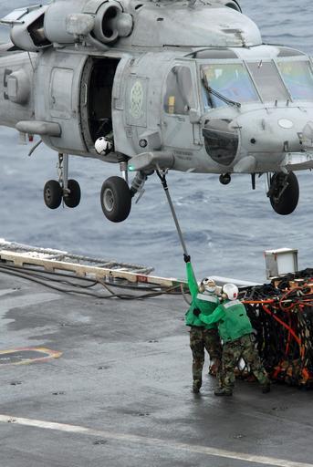Keywords: US Navy 080808-N-7730P-070 Chief Store Keeper Ronald Cruz and Midshipman Danielle Chlopek attach a sling to an HH-60H Seahawk assigned to the.jpg en PACIFIC OCEAN Aug 8 2008 Chief Store Keeper Ronald Cruz and Midshipman Danielle Chlopek attach a sling to an HH-60H Seahawk assigned to the Black Knights of Helicopter Anti-Submarine Squadron HS 4 during a replenishment between the Military Sealift Command fast combat support ship USNS Bridge T-AOE 10 and the Nimitz-class aircraft carrier USS Ronald Reagan CVN 76 The Ronald Reagan Carrier Strike Group is on a routine deployment in the U S 7th Fleet area of responsibility operating in the western Pacific and Indian oceans U S Navy photo by Mass Communication Specialist 3rd Class Gary Prill/Released 2008-08-08 080808-N-7730P-070 Navy http //www navy mil/view_image asp id 62392 U S Navy photo by Mass Communication Specialist 3rd Class Gary Prill PD-USGov-Military-Navy Helicopters at USS Ronald Reagan CVN-76 HH-60H Rescue Hawk |
