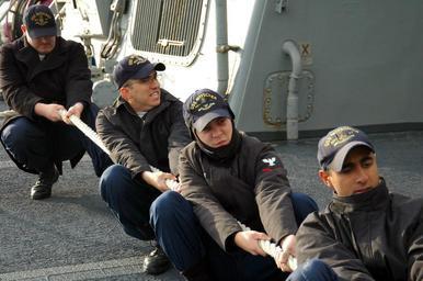 | Keywords: US Navy 081001-N-1706T-002 Fire Controlman 3rd Class Brandon Roehl Sonar Technician (Surface) 3rd Class Brian McKeon, Sonar Technician (Surface) 3rd Class Jesse Lindsey and Sonar Technician (Surface) Manoj Sewal pull a mooring.jpg en FASLANE Scotland Oct 1 2008 Fire Controlman 3rd Class Brandon Roehl left Sonar Technician Surface 3rd Class Brian McKeon Sonar Technician Surface 3rd Class Jesse Lindsey and Sonar Technician Surface Manoj Sewal pull a mooring line tight as the guided-missile destroyer USS Mitscher DDG 57 pulls into Faslane Mitscher is enroute to take part in Exercise Joint Warrior a course designed and led by the joint tactical exercise planning staff JTEPS in the United Kingdom The exercise helps U S ships improve interoperability between allied navies and prepares participants for a role in a joint maritime environment during upcoming deployments U S Navy photo by Mass Communications Specialist 3rd Class Stephen Tate/Released 2008-10-01 081001-N-1706T-002 Navy http //www navy mil/view_image asp id 64803 U S Navy photo by Mass Communications Specialist 3rd Class Stephen Tate PD-USGov-Military-Navy Fire Controlman Joint Warrior 08-2 Aboard USS Mitscher DDG-57 |