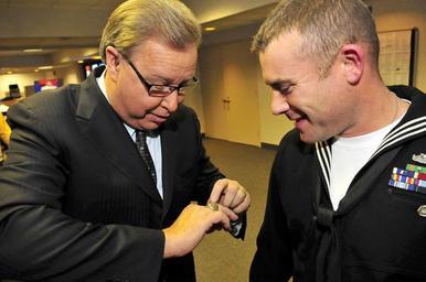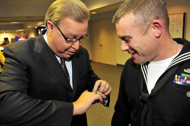 Keywords: US Navy 081117-N-5758H-399 ESPN sports analyst Ron Jaworski, left, shows his Super Bowl ring to Engineman 1st Class Brad Vincent, assigned to the littoral combat ship USS Freedom (LCS 1), during a Monday Night Football game.jpg en ORCHARD PARK N Y Nov 16 2008 ESPN sports analyst Ron Jaworski left shows his Super Bowl ring to Engineman 1st Class Brad Vincent assigned to the littoral combat ship USS Freedom LCS 1 during a Monday Night Football game at Ralph Wilson Stadium Freedom the first of two littoral combat ships designed to operate in shallow water environments is in Buffalo for a scheduled port visit The ship was commissioned Nov 8 in Milwaukee and will make other port calls en route to Norfolk Va U S Navy photo by Mass Communication 3rd Class Specialist Kenneth R Hendrix/Released 2008-11-16 081117-N-5758H-399 Navy http //www navy mil/view_image asp id 66654 U S Navy photo by Mass Communication 3rd Class Specialist Kenneth R Hendrix PD-USGov-Military-Navy Images from US Navy location ORCHARD PARK N Y Super Bowl ring |