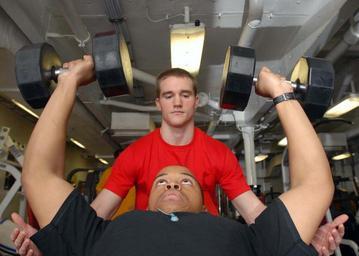 Keywords: US Navy 081206-N-2456S-006 Aviation Boatswain's Mate (Fuel) Airman Joseph Haefner ssists Aviation Boatswain's Mate (Fuel) Airman Nicholas Bell with lifting 60-pound weights.jpg en GULF OF OMAN Dec 6 2008 Aviation Boatswain's Mate Fuel Airman Joseph Haefner top from Lancaster Pa assists Aviation Boatswain's Mate Fuel Airman Nicholas Bell from Joliet Ill with lifting 60-pound weights in the Big Stick Gym aboard the Nimitz-class aircraft carrier USS Theodore Roosevelt CVN 71 Theodore Roosevelt and embarked Carrier Air Wing CVW 8 are on deployment in the U S 5th Fleet area of responsibility and are focused on reassuring regional partners of the United States' commitment to security which promotes stability and global prosperity U S Navy photo by Mass Communication Specialist 3rd Class John Suits/Released 2008-12-06 081206-N-2456S-006 Navy http //www navy mil/view_image asp id 67201 U S Navy photo by Mass Communication Specialist 3rd Class John Suits PD-USGov-Military-Navy Aviation Boatswain's Mates Fuels Aboard USS Theodore Roosevelt CVN-71 Men with dumbbells |