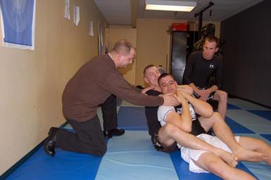 | Keywords: US Navy 090124-N-2425L-002 Master-at-Arms 2nd Class Phillip Staats, from the Naval Air Station (NAS) Jacksonville Security Department instructs Aviation Structural Mechanic Airman William Mastorio on how to apply a choke hold.jpg en JACKSONVILLE Fla Jan 24 2009 Master-at-Arms 2nd Class Phillip Staats from the Naval Air Station NAS Jacksonville Security Department left instructs Aviation Structural Mechanic Airman William Mastorio on how to apply a choke hold on Aviation Machinist's Mate 3rd Class Taylor Proctor as Aviation Machinist's Mate 3rd Class Greg Baker looks on Staats is an instructor in the sport of Submission Grappling and created a team from NAS Jax that participates in tournaments throughout the state U S Navy photo by Kaylee LaRocque/Released 2009-01-24 090124-N-2425L-002 Navy http //www navy mil/view_image asp id 68620 U S Navy photo by Kaylee LaRocque PD-USGov-Military-Navy 2009 at Naval Air Station Jacksonville Master-at-arms Rear naked chokes Back mount grappling |